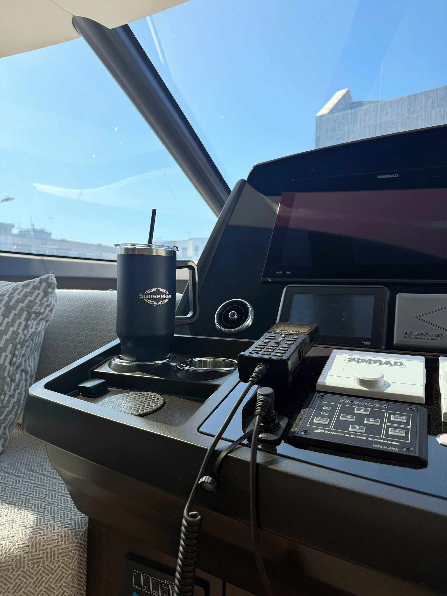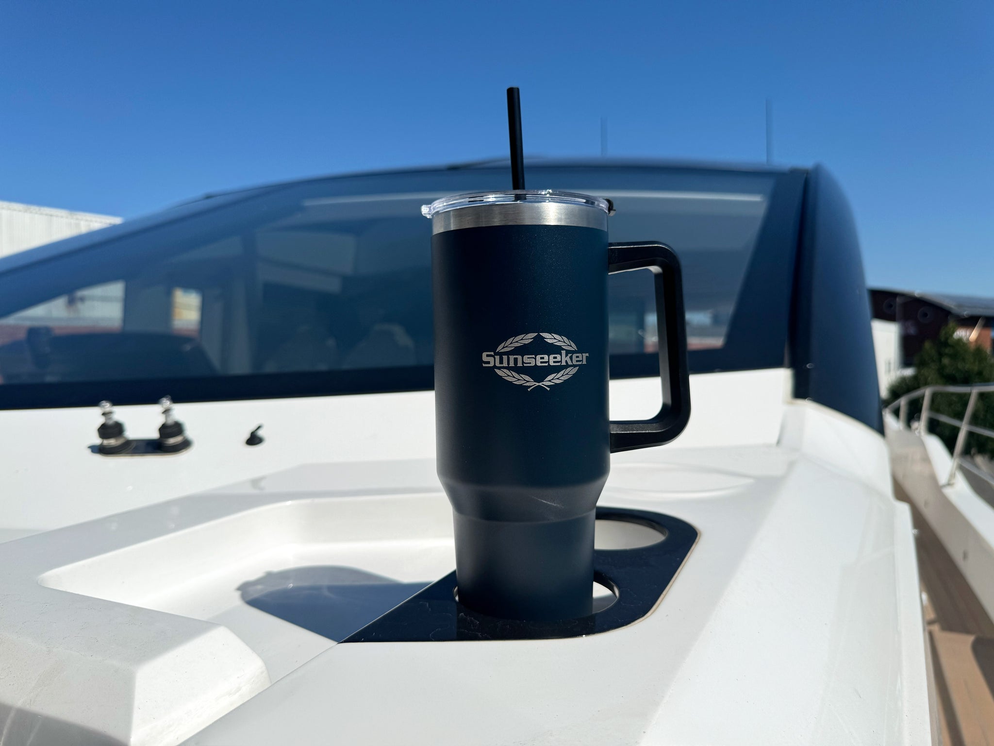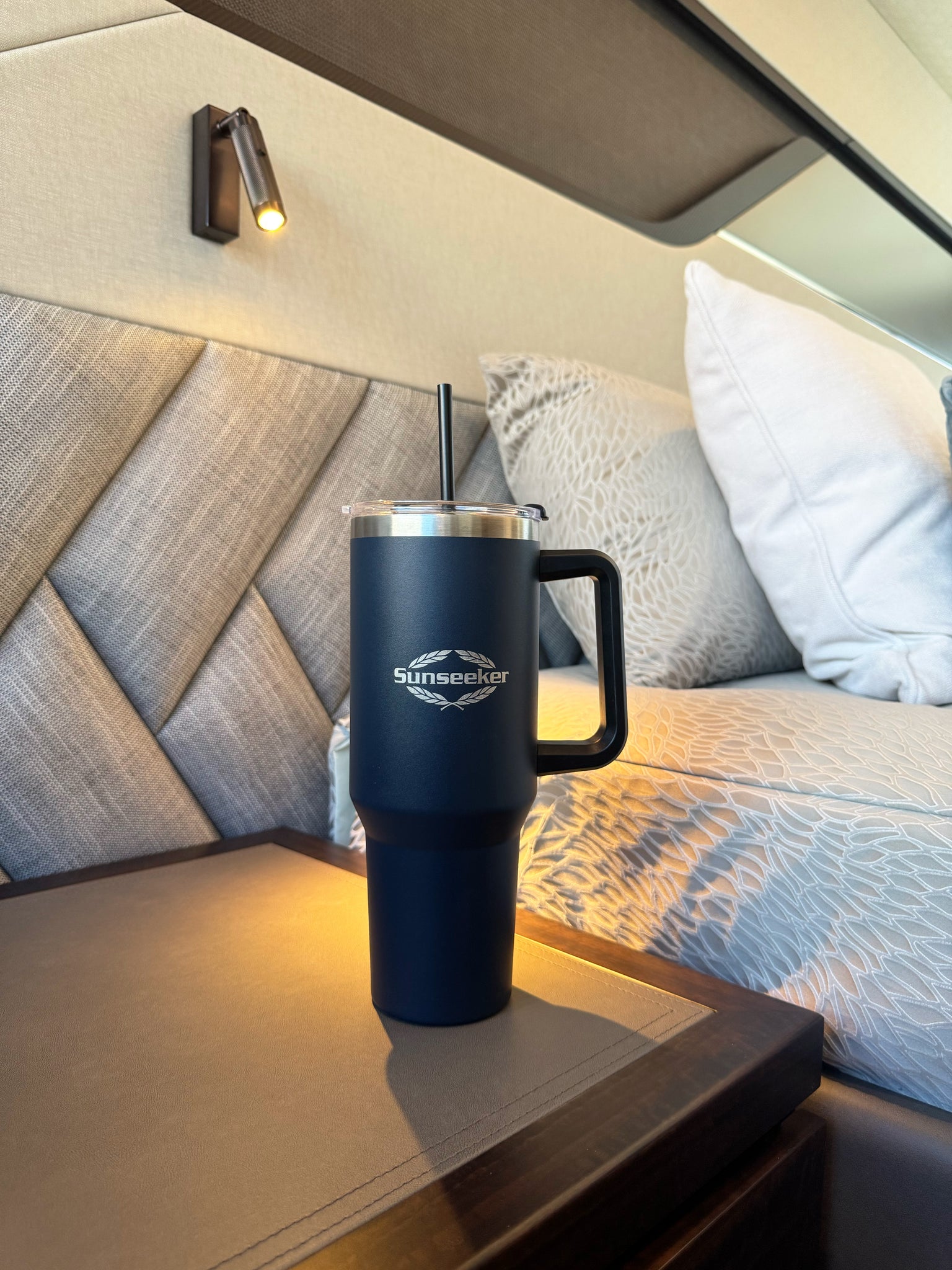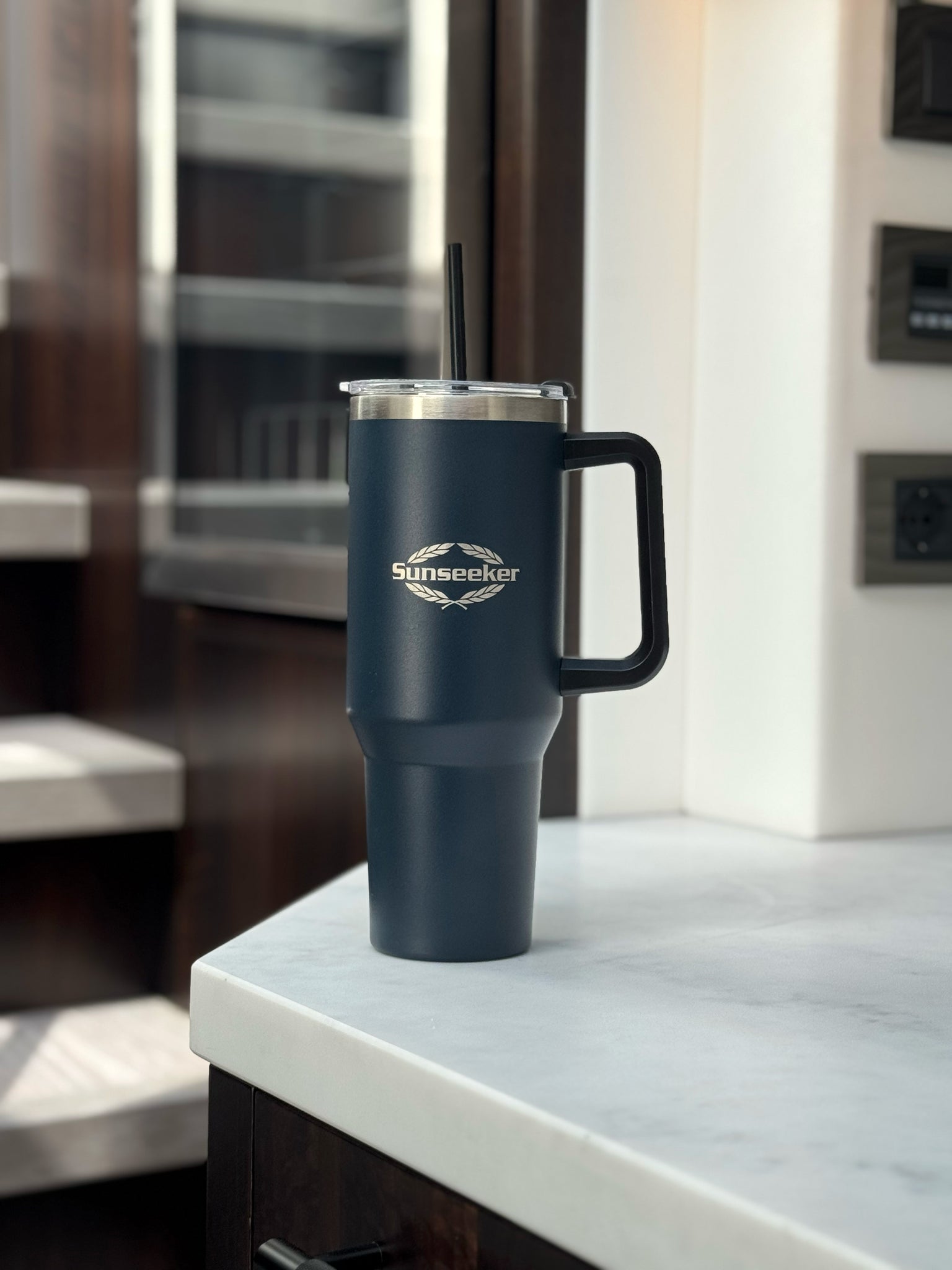 Large double wall recycled stainless steel tumbler (90% recycled stainless and 10% stainless steel) with straw lid including PE straw. The large capacity of 1200 ml is perfect to keep you hydrated. The tapered design of the tumbler allows it to fit into an in-car cup holder. Sleek Sunseeker in silver on one side of tumbler.